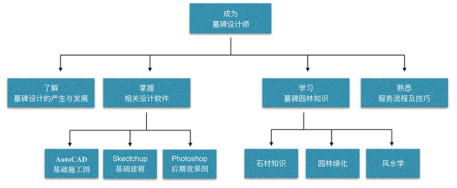 成为墓碑设计师,首先了解墓碑设计的产生与发展,掌握相关设计软件,包括:AutoCAD 基础施工图、Skectchup 基础建模、Photoshop 后期效果图,学习墓碑园林知识,包括:石材知识、园林绿化、风水学等,最后是熟悉服务流程及技巧,学会与客户沟通才能更好地完成设计。希望本网站的免费学习资料能对您有所帮助,愿您能成为一名合格优秀的墓碑设计师,为社会服务!